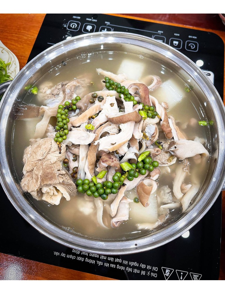 - Đun nước dùng xương, thêm bao tử, tiêu xanh, gừng và nêm nếm gia vị cho vừa ăn.