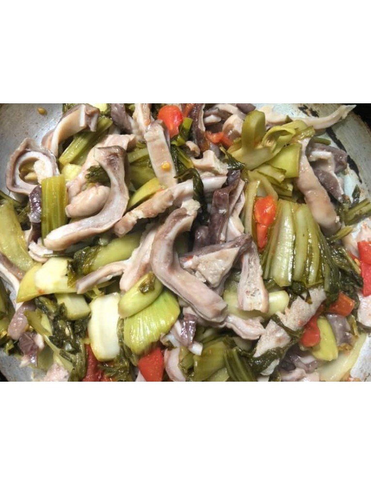 - Xào cho đến khi cải chua và bao tử vừa chín, rắc hành lá lên trên. Dùng với cơm trắng.